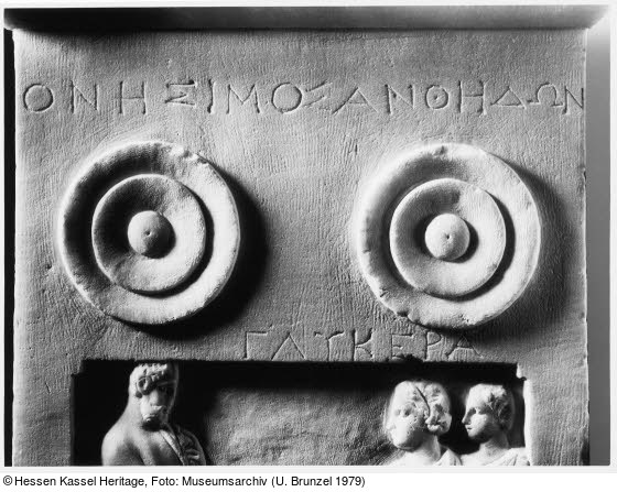 Ob die bescheidene Form auf den sozialen Status des Auftraggebers innerhalb der rigoros gegliederten athenischen Gesellschaft schließen lässt, ist im Falle der Verwendung gebundener, stark stilisierter Figurentypen (Bärtiger im Bürgermantel, thronende Frau, Kinder, Bedienstete, Sklaven, Handschlaggestus) am ehesten zu entscheiden, wenn die Inschriften etwa über Namensformen oder Herkunft des Bürgers Auskunft geben. Auf der Glykera-Stele könnte Onesimos sich als Bürger des böotischen (oder weniger wahrscheinlich des palästinensischen) Anthedon zu erkennen geben, der als Nicht-Athener und vielleicht als Nicht-Vollbürger seiner Familie in Athen anlässlich des Todes seiner Frau diesen Grabstein fertigen und aufstellen ließ. So betrachtet wäre die Glykera-Stele ein weiteres Beispiel für die in Athen entwickelte und über Athen hinaus wirkende Bildprogrammatik des bürgerlich-spätklassischen Polisverständnisses wie das attizierende Aristodika-Grabrelief von Kreta (Kat. 7.2). Die idealtypischen Bilder mit individuellen Namensbeischriften im sepulkralen Bereich werden auch als Ausdruck einer kollektiven Erfahrung der beträchtlich gewachsenen Bedeutung der familiären Gemeinschaft (Oikos) als Kern und wichtigster, gleichwohl bedrängter Bestandteil in den spätklassischen Poleis verstanden.