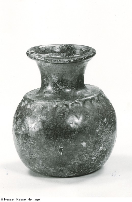 Gelbgrünes Glas. Fast ganz von schwärzlicher Verwitterungsschicht überzogen. Iris. |