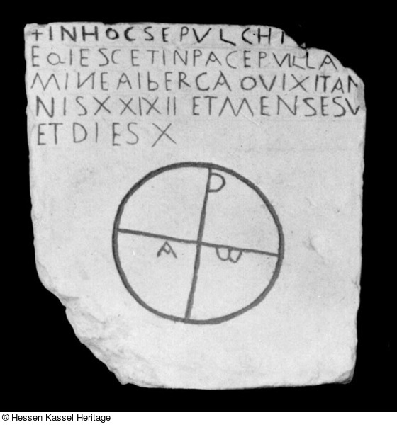 Die Texte der spätantiken und frühmittelalterlichen Grabinschriften verwenden häufig wiederkehrende Formeln, die eine zeitliche Eingrenzung ermöglichen. Die erweiterte Eingangsformel in hoc sepulcro requiescit in pace spricht in Verbindung mit dem Kreuz am Textanfang und der Form des Christogramms für eine Datierung des Aiberga-Steins in das 6. Jh. n. Chr. (Boppert 1971; Engemann – Rüger 1991, 14. 70 ff. Nr. 14). Die vulgärlateinischen Lautverschiebungen, die grammatikalischen Fehler und Verschreibungen sind typisch für die frühchristlichen Inschriften des Mittelrheingebietes, dessen Bevölkerung mit dem ›klassischen‹ Latein nicht mehr vertraut war (Schmitz 1991). In spätantiker und frühmittelalterlicher Zeit lebten in der Region Romanen und Franken nebeneinander (Schmitz 1991). Dies trug zu einer Romanisierung der fränkischen Bevölkerungsgruppe bei, zu der auch Aiberga gehörte. In ihrer Grabinschrift, die sich von typisch merowingisch-fränkischen unterscheidet (Boppert 1971), wird der Romanisierungsprozeß sichtbar.