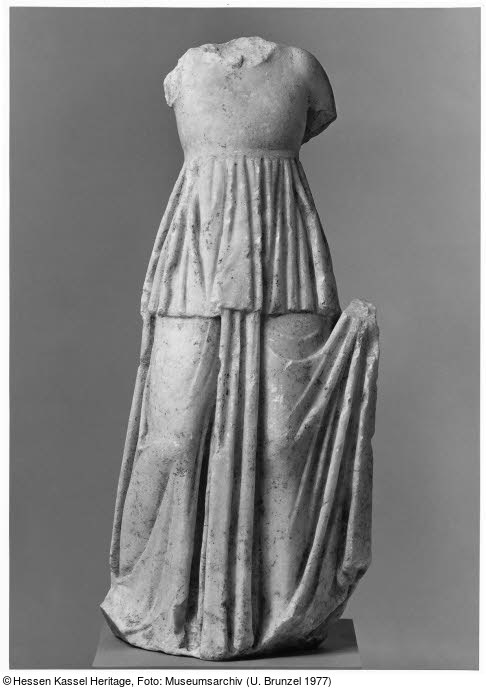 Plastisch ausgearbeitet sind die Körperformen und das Gewand unterhalb der Gürtung nur auf der Vorder- und Spielbeinseite. Dem glatten sanft gerundeten Oberteil folgt der ziemlich gleichmäßig modellierte, gereihte Faltenduktus des horizontal abschließenden Überschlags; die größte plastische Differenzierung mit Steilfalten, Zugfalten und kleinen Bogenfalten, zum Teil durch tiefere Rinnen getrennt, wird im Bereich der Beine erreicht. Die Rückseite und die linke Nebenseite mit dem gerafften Chiton verzichten weitgehend auf eine detaillierte Modellierung und beschränken sich auf die strukturelle Anlage des dreistufigen Figurenaufbaus.