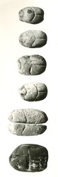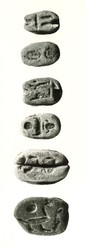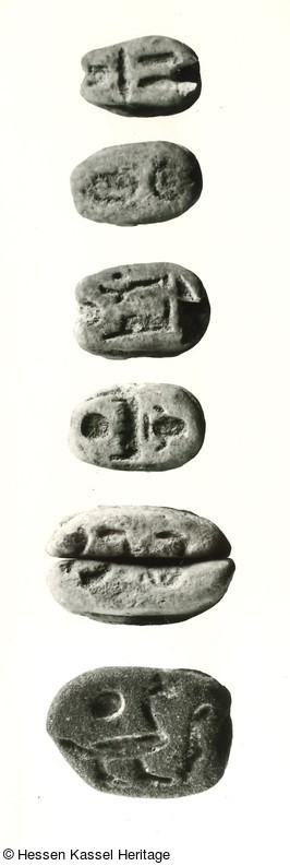 Die kleinen Fayenceskarabäen sind an ihren Unterseiten mit Ornamenten (S 79 b-d und f) bzw. mit figürlichen Motiven wie mit einem Wasservogel (S 79 a) oder einem Gefäß (S 79 e) verziert; die stark gewölbte andere Seite zeigt jeweils den aus dem ägyptischen Kulturkreis stammenden Käfer (Skarabäus). Es handelt sich nicht um geschnittene Steine, sondern um frei geformte oder mittels einer Model gebildete Schmuckgegenstände aus Fayence, die jedoch hinsichtlich des Motivs mit der Glyptik in engem Zusammenhang stehen. Ähnliche Skarabäen finden sich - außer in Ägypten selbst - häufig in phönizischen Gräbern, und es ist möglich, daß es sich bei diesen sechs Stücken um Importware aus dem Bereich des Nildeltas handelt. Die Skarabäen stammen aus einem reich ausgestatteten samischen Frauengrab archaischer Zeit; weitere Gegenstände aus diesem Grab wie Keramik und Schmuck befinden sich ebenfalls in Kassel.